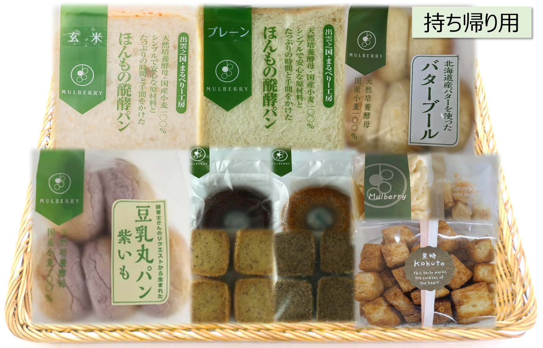 原材料:小麦粉(国産)、黒糖(沖縄県産)、木次牛乳(島根県産)、よつ葉バター(生乳(北海道産))、小麦全粒粉(北海道産)、生クリーム(国産)、あこ天然酵母、てんさいグラニュ糖(北海道産)、竹本油脂の太白ごま油、赤穂の天塩、三温糖